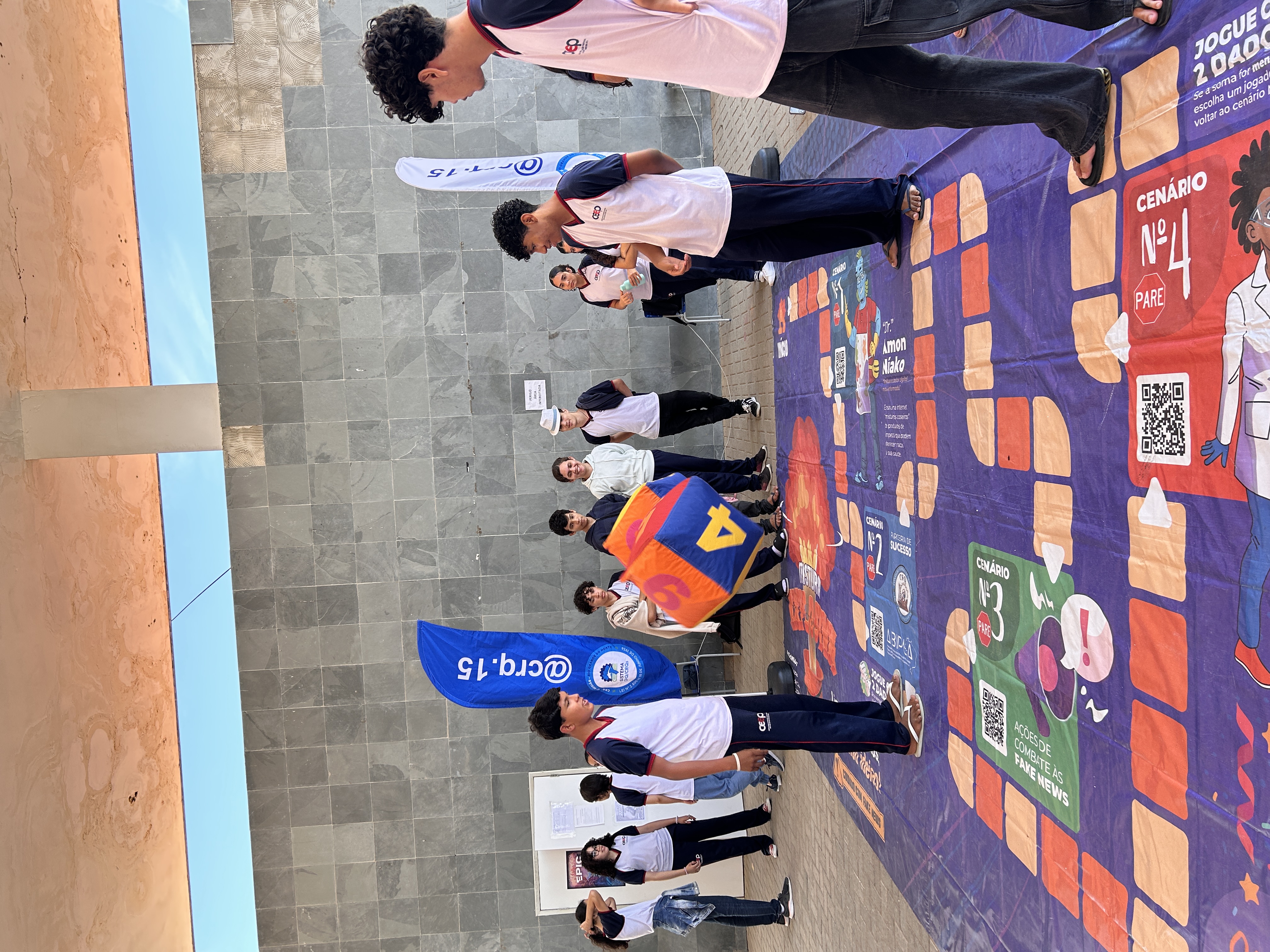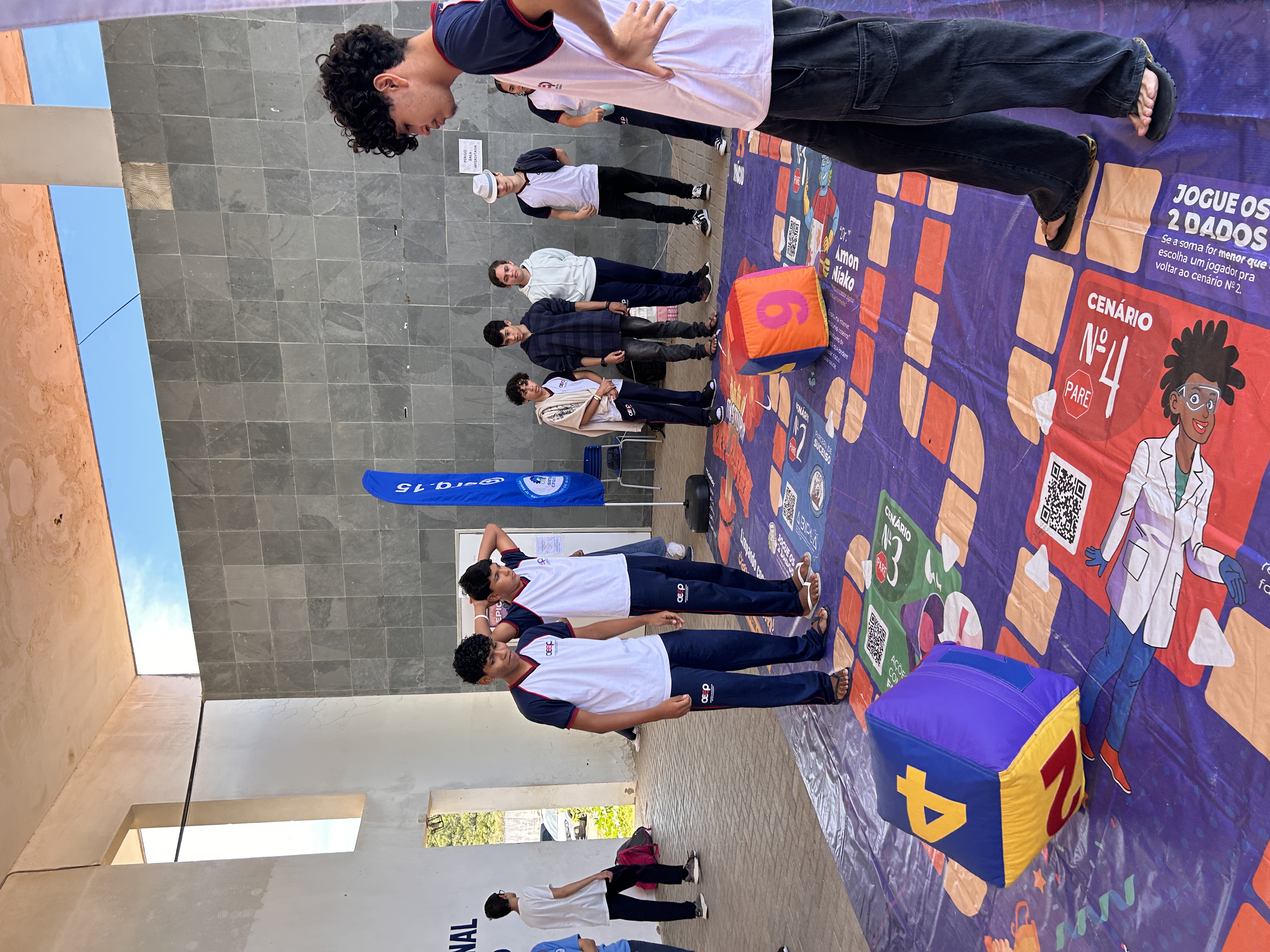 Ao final da palestra, os alunos participaram de uma dinâmica especial em um tapete interativo, que reforçou de forma lúdica os conceitos apresentados e proporcionou um momento de descontração e aprendizado.