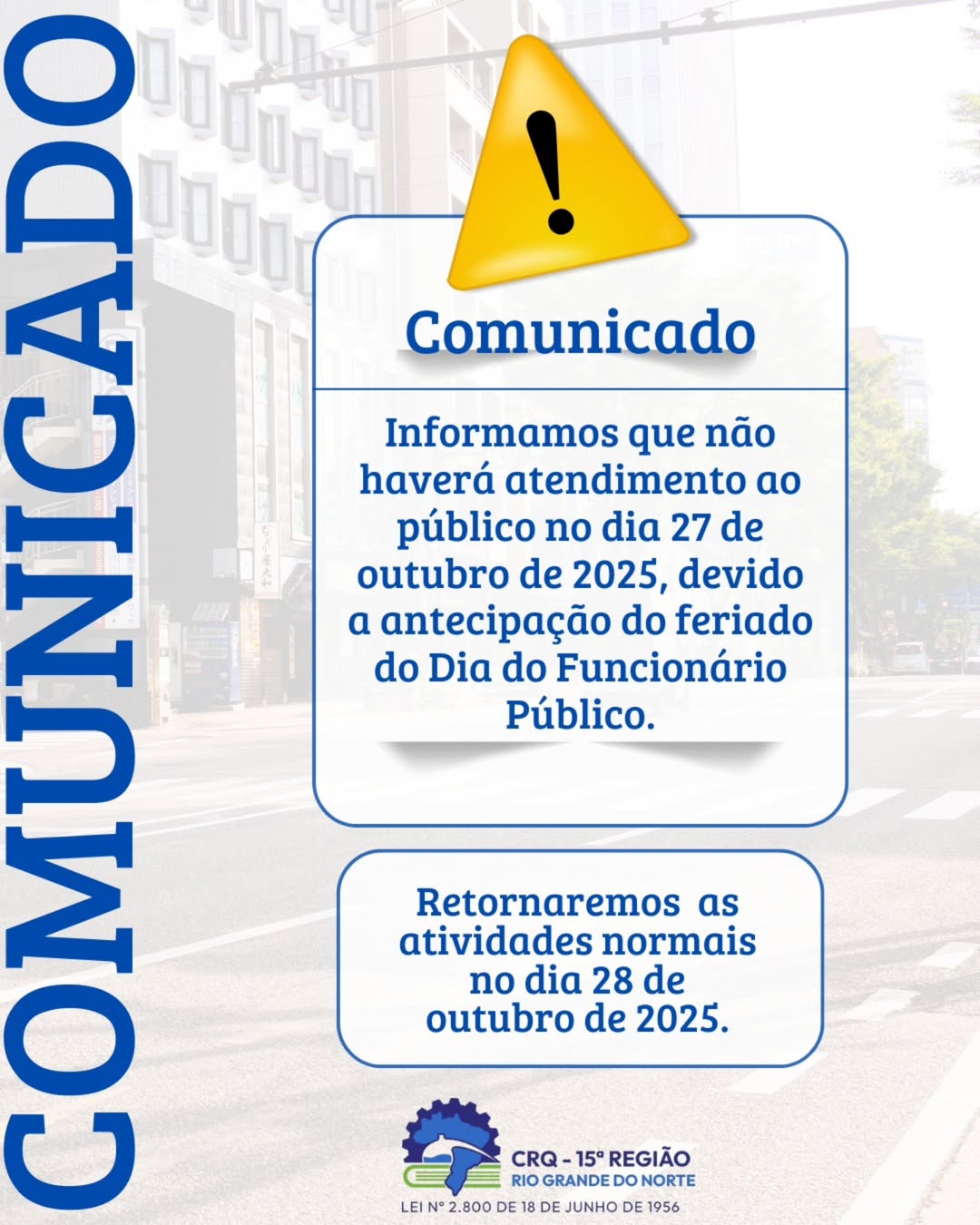 Informamos que não haverá atendimento ao público no dia 27de outubro de 2025, devido a antecipação do feriado do dia do FuncionárioPúblico.